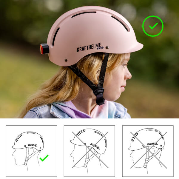 Achten Sie vor Antritt der Fahrt auf korrekten Sitz des Helmes. Das Rastsystem des Kinnriemens muss immer komplett geschlossen sein. Die Gurtbänder müssen straff anliegen. Bitte überprüfen Sie dies gegebenenfalls auch bei begleitenden Kindern.